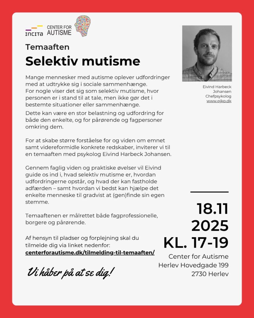 Center for Autisme afholder en række temaarangementer. Det første arrangement sker d.18 september 2024: Om mulighederne i barnets lov v/ handicapkonsulent og Socialrådgiver Inge Louv.